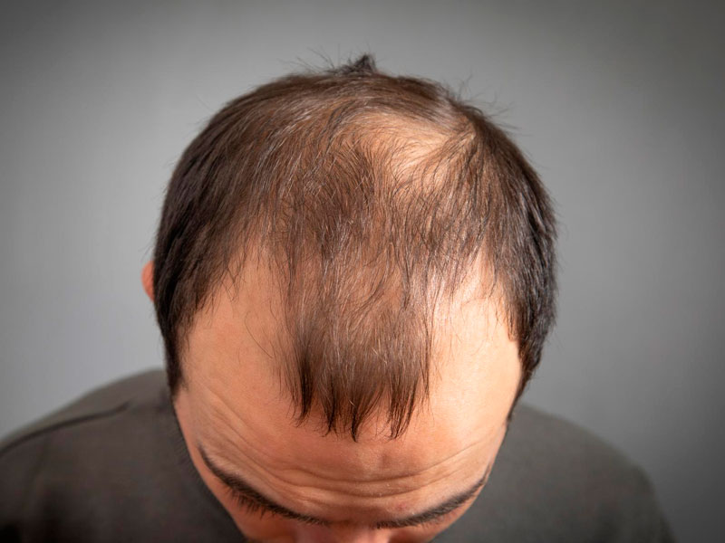 Homens: Recuo da linha frontal do cabelo e rarefação no topo da cabeça.